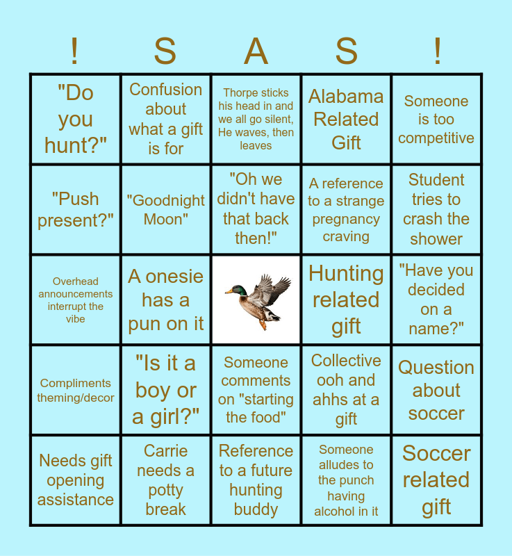 This bingo card has a free space and 34 words: "When is she due?", Someone alludes to the punch having alcohol in it, A reference about the baby being good at Science, "Are you/Carrie excited?", Compliments theming/decor, "Goodnight Moon", Someone is too competitive, Needs gift opening assistance, Confusion about what a gift is for, White comes in, gives some high fives/pats on the back, then leaves, "Oh we didn't have that back then!", Thorpe sticks his head in and we all go silent, He waves, then leaves, Dr. Seuss book, Science related gift, Hunting related gift, Student tries to crash the shower, Carrie needs a potty break, Overhead announcements interrupt the vibe, "Is it a boy or a girl?", Collective ooh and ahhs at a gift, Someone comments on "starting the food", Stuffed animal given, "Do you hunt?", "Have you decided on a name?", Reference to a future hunting buddy, Soccer related gift, Alabama Related Gift, Someone gives unsolicited advice, A reference to a strange pregnancy craving, "Push present?", A gift is missing a name so someone yells "THAT ONE IS MINE!", A onesie has a pun on it, Question about soccer and Handmade gift.