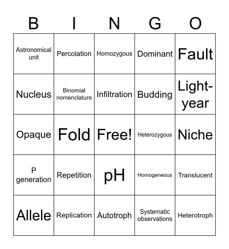 This bingo card has a free space and 56 words: Acceleration, Allele, Amplitude, Astronomical unit, Autotroph, Binary fission, Binomial nomenclature, Boiling point, Budding, Chemical properties, Dominant, Dwarf planet, Empirical evidence, Eukaryote, Evolution, F1 generation, Fault, Fold, Heterogeneous, Heterotroph, Heterozygous, Homeostasis, Homogeneous, Homozygous, Hypothesis, Infiltration, Kingdom, Law, Light-year, Melting point, Model, Molecule, Nebula, Net force, Niche, Nucleus, Opaque, Outcome variable (dependent), P generation, Percolation, pH, Pressure, Prokaryote, Recessive, Regeneration, Repetition, Replication, Saturation, Solute, Solvent, Systematic observations, Temperature, Test variable (independent), Theory, Translucent and Transparent.
