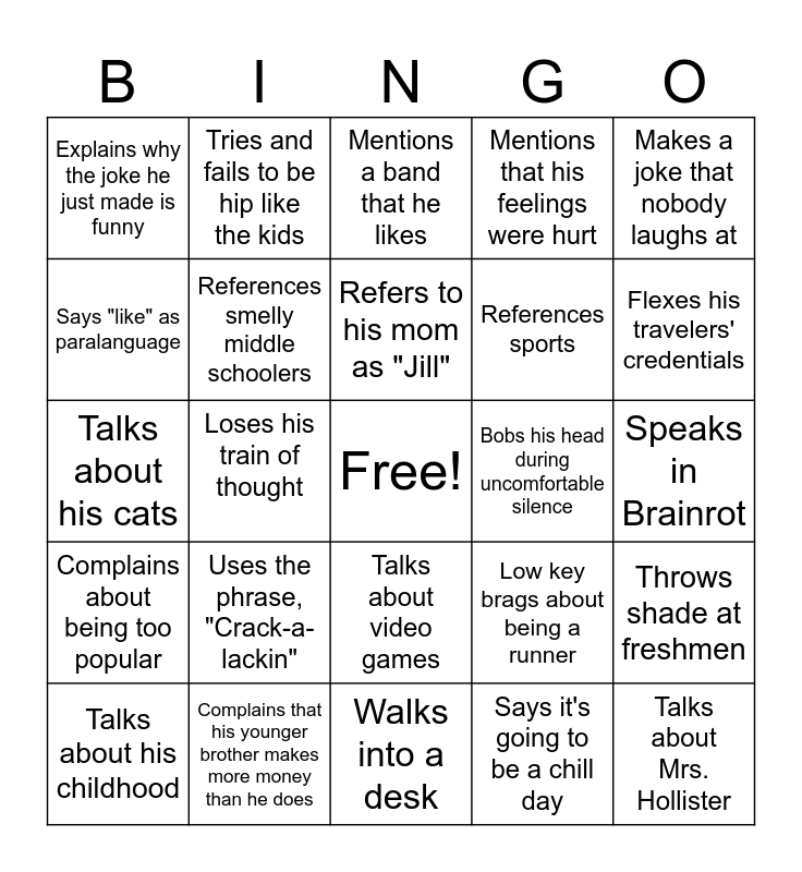 This bingo card has a free space and 24 words: Uses the phrase, "Crack-a-lackin", Complains that his younger brother makes more money than he does, Refers to his mom as "Jill", Talks about his childhood, Makes a joke that nobody laughs at, Explains why the joke he just made is funny, Says "like" as paralanguage, Tries and fails to be hip like the kids, Bobs his head during uncomfortable silence, Talks about video games, References sports, Talks about his cats, Low key brags about being a runner, Throws shade at freshmen, References smelly middle schoolers, Says it's going to be a chill day, Speaks in Brainrot, Mentions a band that he likes, Flexes his travelers' credentials, Loses his train of thought, Talks about Mrs. Hollister, Complains about being too popular, Mentions that his feelings were hurt and Walks into a desk.