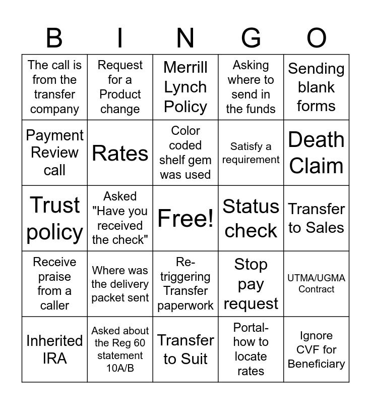 This bingo card has a free space and 24 words: Where was the delivery packet sent, Asked about the Reg 60 statement 10A/B, Color coded shelf gem was used, Inherited IRA, Sending blank forms, The call is from the transfer company, Payment Review call, Request for a Product change, Status check, Re-triggering Transfer paperwork, Satisfy a requirement, Trust policy, Stop pay request, UTMA/UGMA Contract, Rates, Portal-how to locate rates, Transfer to Sales, Merrill Lynch Policy, Death Claim, Asked "Have you received the check", Ignore CVF for Beneficiary, Receive praise from a caller, Asking where to send in the funds and Transfer to Suit.