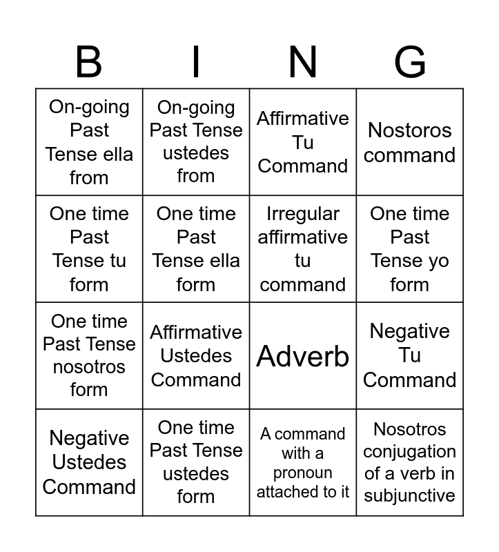 This bingo card has 24 words: A subjunctive trigger phrase, On-going Past Tense yo from, One time Past Tense yo form, On-going Past Tense tu from, One time Past Tense tu form, On-going Past Tense ella from, One time Past Tense ella form, On-going Past Tense ustedes from, One time Past Tense ustedes form, On-going Past Tense nosotros from, One time Past Tense nosotros form, Adverb, -ing verb, Noun ending in -ity, Irregular affirmative tu command, -ing verb, A command with a pronoun attached to it, Affirmative Tu Command, Affirmative Ustedes Command, Negative Tu Command, Negative Ustedes Command, Nosotros conjugation of a verb in subjunctive, Nostoros command and Yo conjugation of a verb in subjunctive.