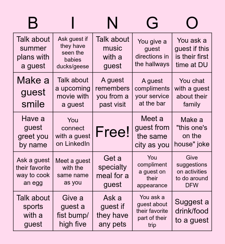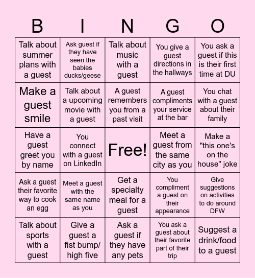 This bingo card has a free space and 24 words: Meet a guest with the same name as you, Give a guest a fist bump/ high five, A guest remembers you from a past visit, Talk about sports with a guest, You ask a guest if this is their first time at DU, Talk about summer plans with a guest, Make a guest smile, Ask guest if they have seen the babies ducks/geese, Meet a guest from the same city as you, Get a specialty meal for a guest, A guest compliments your service at the bar, Have a guest greet you by name, You compliment a guest on their appearance, Give suggestions on activities to do around DFW, Talk about a upcoming movie with a guest, You ask a guest about their favorite part of their trip, Make a "this one's on the house" joke, Talk about music with a guest, You chat with a guest about their family, You connect with a guest on LinkedIn, Suggest a drink/food to a guest, Ask a guest their favorite way to cook an egg, You give a guest directions in the hallways and Ask a guest if they have any pets.