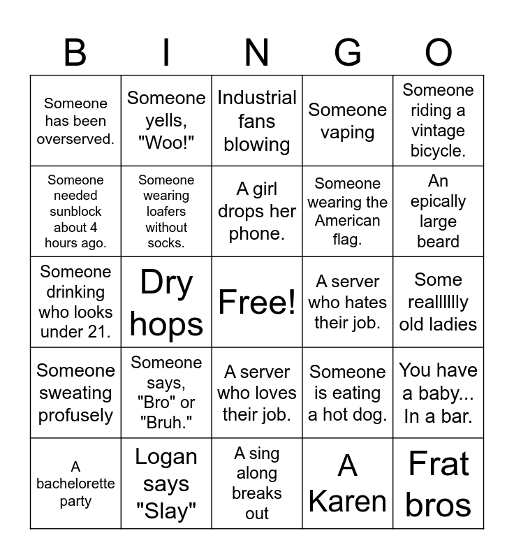 This bingo card has a free space and 24 words: Someone says, "Bro" or "Bruh.", Logan says "Slay", A girl drops her phone., A bachelorette party, Someone riding a vintage bicycle., Someone has been overserved., Someone needed sunblock about 4 hours ago., Someone yells, "Woo!", A server who hates their job., A server who loves their job., Someone wearing the American flag., Someone drinking who looks under 21., Someone is eating a hot dog., You have a baby... In a bar., Someone wearing loafers without socks., A Karen, Some realllllly old ladies, Industrial fans blowing, An epically large beard, Dry hops, Frat bros, Someone sweating profusely, Someone vaping and A sing along breaks out.