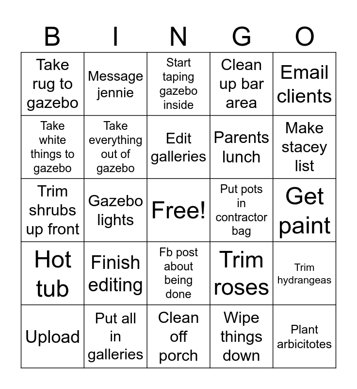 This bingo card has a free space and 24 words: Finish editing, Put all in galleries, Edit galleries, Upload, Email clients, Take rug to gazebo, Take white things to gazebo, Message jennie, Put pots in contractor bag, Fb post about being done, Parents lunch, Trim shrubs up front, Trim roses, Trim hydrangeas, Take everything out of gazebo, Wipe things down, Get paint, Start taping gazebo inside, Make stacey list, Gazebo lights, Plant arbicitotes, Hot tub, Clean up bar area and Clean off porch.