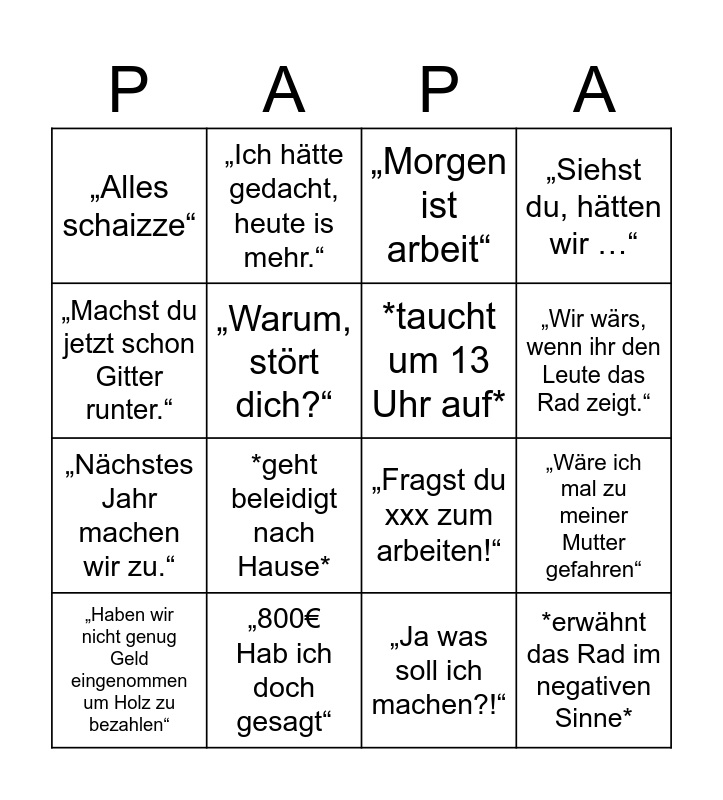 This bingo card has 16 words: „800€ Hab ich doch gesagt“, „Wäre ich mal zu meiner Mutter gefahren“, „Morgen ist arbeit“, „Alles schaizze“, „Nächstes Jahr machen wir zu.“, „Ich hätte gedacht, heute is mehr.“, „Fragst du xxx zum arbeiten!“, „Ja was soll ich machen?!“, „Machst du jetzt schon Gitter runter.“, „Warum, stört dich?“, „Haben wir nicht genug Geld eingenommen um Holz zu bezahlen“, „Siehst du, hätten wir …“, *geht beleidigt nach Hause*, „Wir wärs, wenn ihr den Leute das Rad zeigt.“, *taucht um 13 Uhr auf* and *erwähnt das Rad im negativen Sinne*.