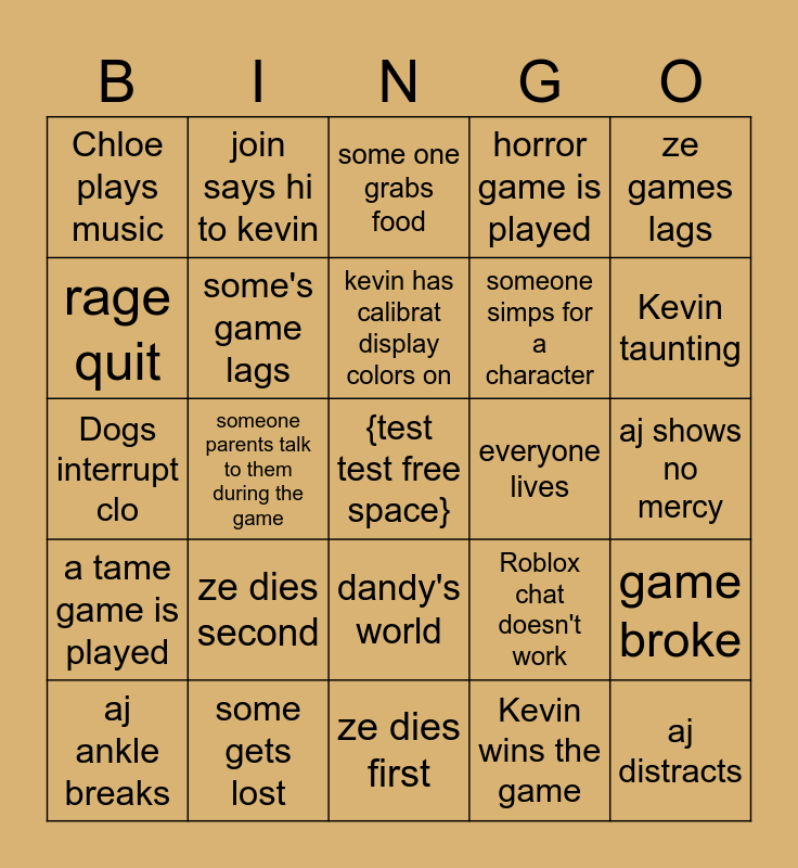This bingo card has a free space and 54 words: ze screams, a tame game is played, aj and Kevin have beef, kale sends cat photos, dandy's world, cookie run kingdom, horror game is played, art gets brought up, rage quit, Chloe screams, Chloe plays music, Kevin leaves the call then rejoins the call, some gets lost, aj ankle breaks, aj dies because of ankle breaking, ze dies first, aj distracts, someone simps for a character, ze says miss ma'ma, aj shows no mercy, Roblox chat doesn't work, everyone dies, everyone lives, ze games lags, some rages in the game, join says hi to kevin, someone breaks the game, some picks a game thinking that its not a horror game, ze's game lags, Kevin wins the game, mic trouble, some makes a sus comment, Roblox chat doesn't work, mic trouble, some one grabs food, everyone lives, Dogs interrupt clo, game broke, Wyatt joins the call, some's game lags, Kevin beats the game, everyone but Kevin beats the game, Chloe dies first, ze dies first, ze dies second, chloe dies second, someone does something sus, aj says language, kevin has calibrat display colors on, someone parents talk to them during the game, Kevin taunting, aj has lag, jon joins the game and Chloe leaves the game out of fear.