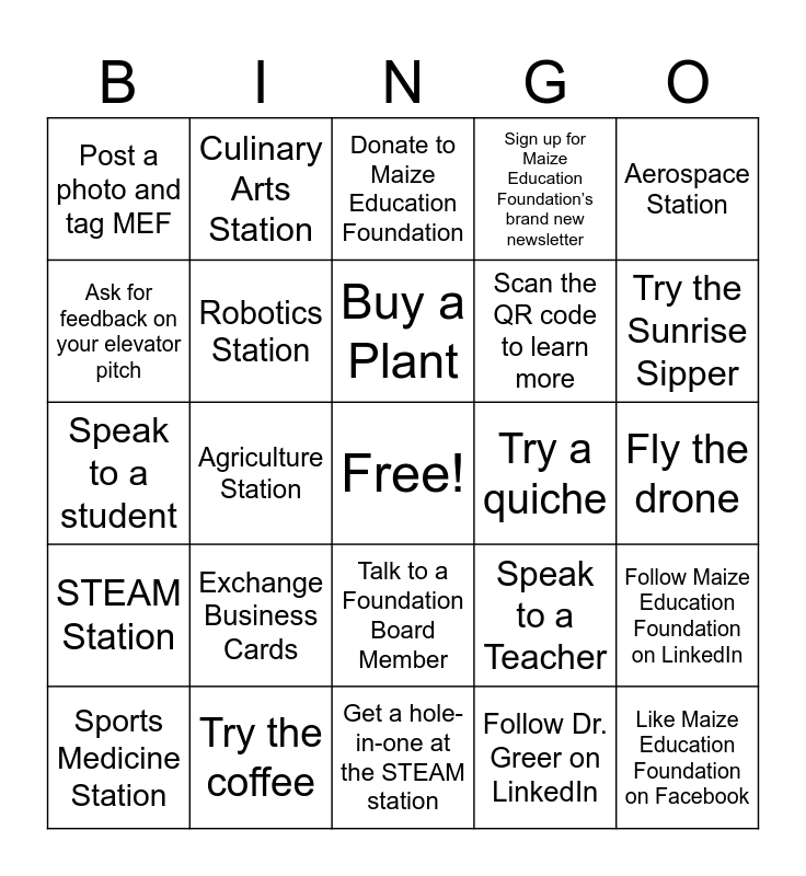 This bingo card has a free space and 33 words: Fire Science Station, Broadcast Station, Agriculture Station, Carpentry Station, STEAM Station, Robotics Station, Aerospace Station, Sports Medicine Station, Culinary Arts Station, Welding Station, Buy a Plant, Donate to Maize Education Foundation, Try a muffin, Try a scone, Try a quiche, Try the Sunrise Sipper, Try the coffee, Speak to a student, Exchange Business Cards, Speak to a Teacher, Talk to a Foundation Board Member, Talk to a Board of Education Member, Post a photo and tag MEF, Fly the drone, Get a hole-in-one at the STEAM station, Like Maize Education Foundation on Facebook, Sign up for Maize Education Foundation’s brand new newsletter, Scan the QR code to learn more, Ask for feedback on your elevator pitch, Follow Maize Education Foundation on LinkedIn, Like Maize USD 266 on Facebook, Follow Dr. Greer on LinkedIn and Sign up for the Maize USD 266 Maize Pulse Newsletter.