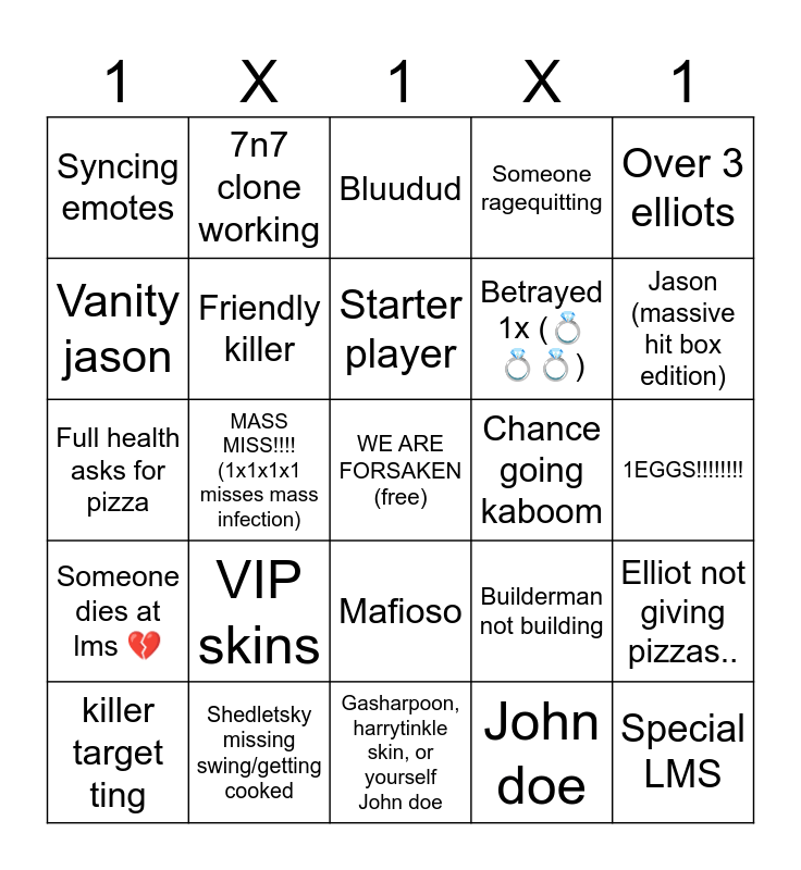 This bingo card has a free space and 24 words: VIP skins, Shedletsky missing swing/getting cooked, Starter player, killer target ting, Over 3 elliots, Syncing emotes, Vanity jason, 7n7 clone working, Chance going kaboom, Mafioso, Betrayed 1x (💍💍💍), Full health asks for pizza, Builderman not building, Elliot not giving pizzas.., Friendly killer, John doe, 1EGGS!!!!!!!!, Bluudud, Jason (massive hit box edition), MASS MISS!!!! (1x1x1x1 misses mass infection), Special LMS, Someone dies at lms 💔, Someone ragequitting and Gasharpoon, harrytinkle skin, or yourself John doe.