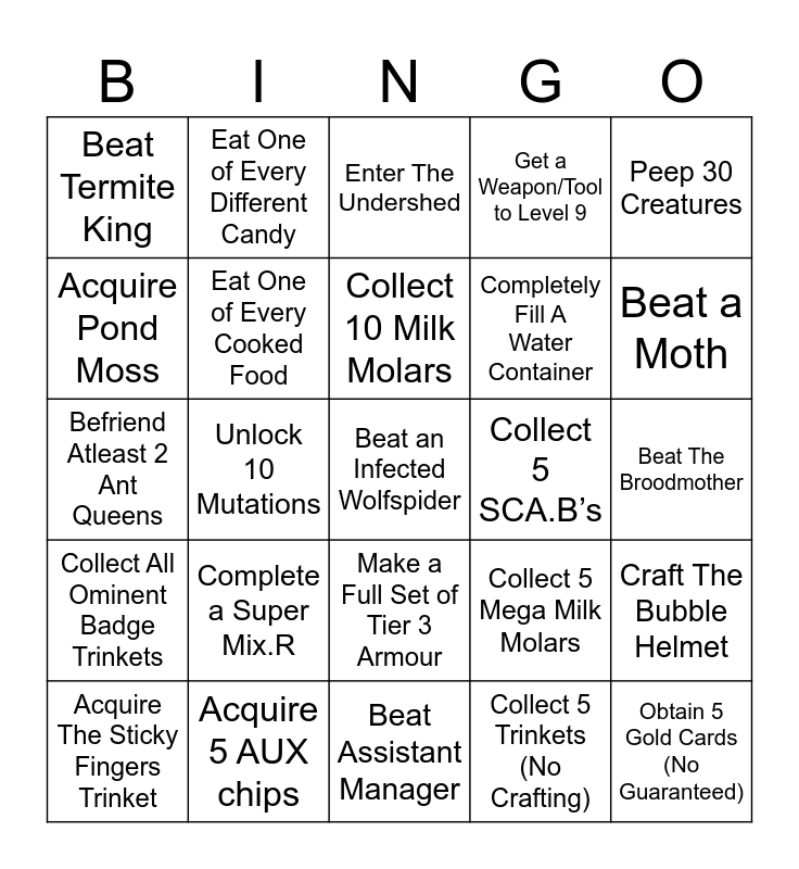 This bingo card has a free space and 24 words: Complete a Super Mix.R, Acquire 5 AUX chips, Collect 10 Milk Molars, Acquire The Sticky Fingers Trinket, Peep 30 Creatures, Beat Termite King, Acquire Pond Moss, Eat One of Every Different Candy, Collect 5 SCA.B’s, Make a Full Set of Tier 3 Armour, Completely Fill A Water Container, Befriend Atleast 2 Ant Queens, Collect 5 Mega Milk Molars, Craft The Bubble Helmet, Eat One of Every Cooked Food, Collect 5 Trinkets (No Crafting), Beat The Broodmother, Enter The Undershed, Beat a Moth, Unlock 10 Mutations, Obtain 5 Gold Cards (No Guaranteed), Collect All Ominent Badge Trinkets, Get a Weapon/Tool to Level 9 and Beat Assistant Manager.