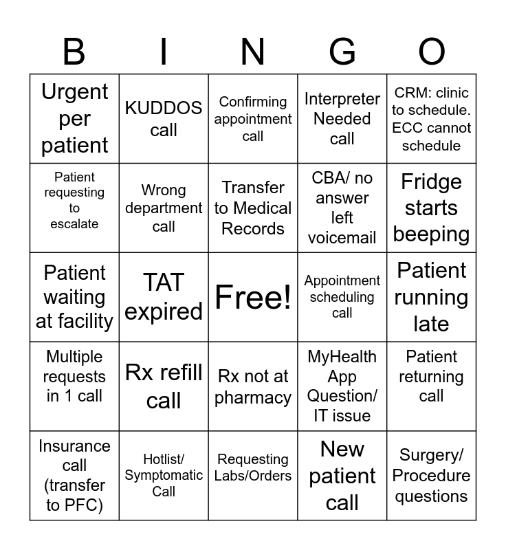 This bingo card has a free space and 24 words: Rx refill call, Hotlist/ Symptomatic Call, Transfer to Medical Records, Insurance call (transfer to PFC), CRM: clinic to schedule. ECC cannot schedule, Urgent per patient, Patient requesting to escalate, KUDDOS call, Appointment scheduling call, Rx not at pharmacy, CBA/ no answer left voicemail, Patient waiting at facility, MyHealth App Question/ IT issue, Patient returning call, Wrong department call, New patient call, Patient running late, Confirming appointment call, Fridge starts beeping, TAT expired, Surgery/ Procedure questions, Multiple requests in 1 call, Interpreter Needed call and Requesting Labs/Orders.