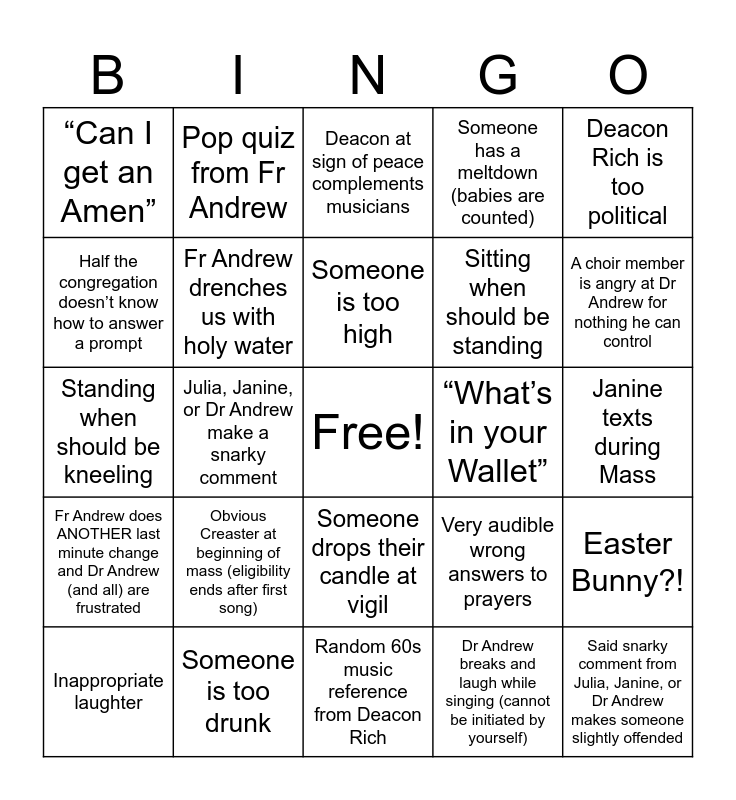 This bingo card has a free space and 24 words: Obvious Creaster at beginning of mass (eligibility ends after first song), Someone is too drunk, Someone is too high, Inappropriate laughter, Deacon Rich is too political, “Can I get an Amen”, Half the congregation doesn’t know how to answer a prompt, Pop quiz from Fr Andrew, “What’s in your Wallet”, Someone drops their candle at vigil, Sitting when should be standing, Standing when should be kneeling, Very audible wrong answers to prayers, Easter Bunny?!, Fr Andrew drenches us with holy water, Dr Andrew breaks and laugh while singing (cannot be initiated by yourself), Janine texts during Mass, Deacon at sign of peace complements musicians, A choir member is angry at Dr Andrew for nothing he can control, Julia, Janine, or Dr Andrew make a snarky comment, Said snarky comment from Julia, Janine, or Dr Andrew makes someone slightly offended, Fr Andrew does ANOTHER last minute change and Dr Andrew (and all) are frustrated, Someone has a meltdown (babies are counted) and Random 60s music reference from Deacon Rich.
