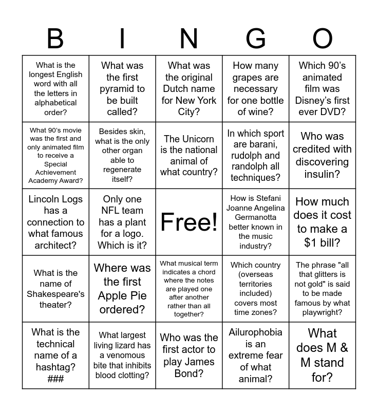 This bingo card has a free space and 24 words: What is the technical name of a hashtag? ###, Where was the first Apple Pie ordered?, The Unicorn is the national animal of what country?, Ailurophobia is an extreme fear of what animal?, Which 90’s animated film was Disney’s first ever DVD?, What is the longest English word with all the letters in alphabetical order?, What was the first pyramid to be built called?, What was the original Dutch name for New York City?, How is Stefani Joanne Angelina Germanotta better known in the music industry?, How much does it cost to make a $1 bill?, Lincoln Logs has a connection to what famous architect?, Besides skin, what is the only other organ able to regenerate itself?, Which country (overseas territories included) covers most time zones?, The phrase "all that glitters is not gold" is said to be made famous by what playwright?, What 90’s movie was the first and only animated film to receive a Special Achievement Academy Award?, What largest living lizard has a venomous bite that inhibits blood clotting?, Who was the first actor to play James Bond?, How many grapes are necessary for one bottle of wine?, Who was credited with discovering insulin?, What is the name of Shakespeare's theater?, Only one NFL team has a plant for a logo. Which is it?, What musical term indicates a chord where the notes are played one after another rather than all together?, In which sport are barani, rudolph and randolph all techniques? and What does M & M stand for?.