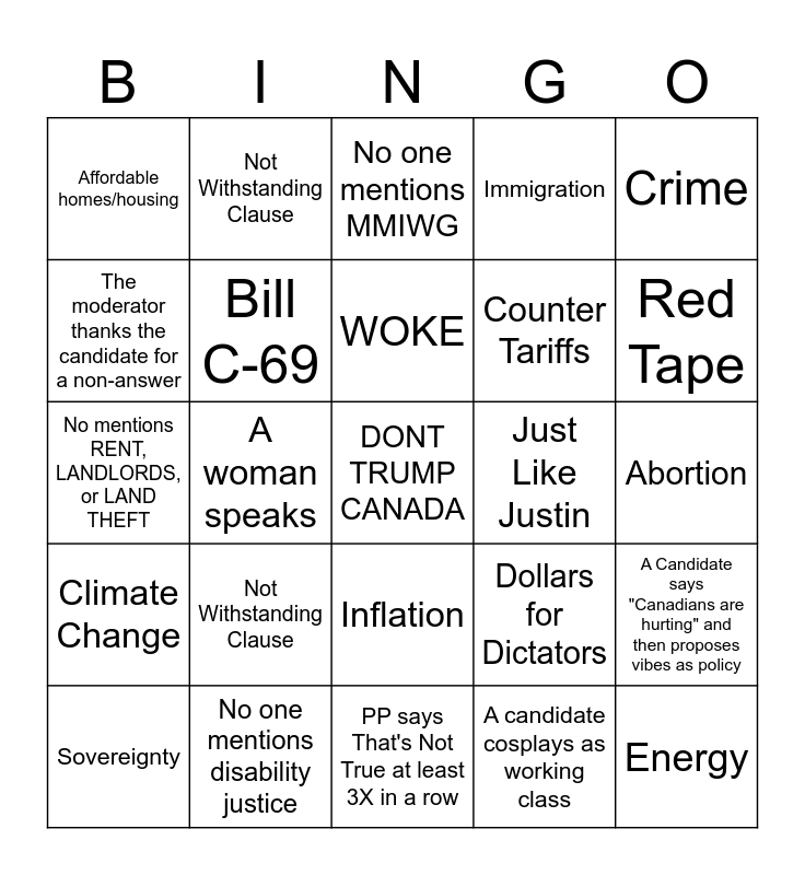 This bingo card has a free space and 39 words: You yell f*ck off with your whole chest at your screen, Bureaucracy, Groceries, Bill C-69, Sovereignty, Inflation, WOKE, Industrial Carbon Tax, Crime, Climate Change, A woman speaks, Immigration, Energy, Abortion, Just Like Justin, Not Withstanding Clause, Fourth Liberal Term, Affordable homes/housing, Trump, Dollars for Dictators, The moderator thanks the candidate for a non-answer, PP says That's Not True at least 3X in a row, Counter Tariffs, Red Tape, Cut(s), Big Polluters, Consultation Process, Indigenous Rights, Gaza, Not Withstanding Clause, No one mentions the TRC's 94 calls to action, No one mentions Trans Rights, No one mentions MMIWG, No one mentions disability justice, A candidate cosplays as working class, Someone in your group chat insists "Pierre isn't Trump", A Candidate says "Canadians are hurting" and then proposes vibes as policy, No mentions RENT, LANDLORDS, or LAND THEFT and No one mentions anti-black racism.