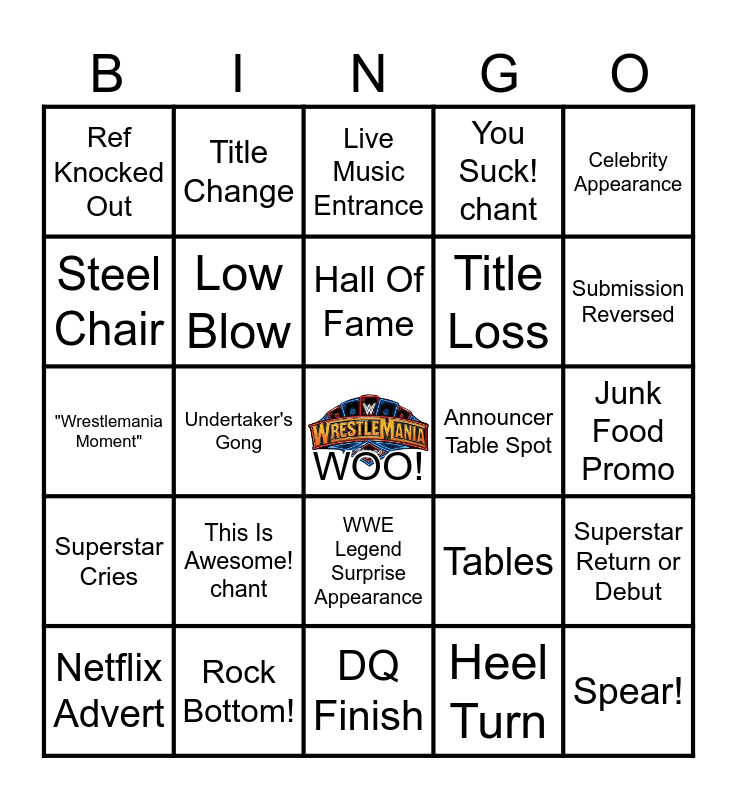 This bingo card has a free space and 24 words: Netflix Advert, This Is Awesome! chant, Hall Of Fame, Heel Turn, Celebrity Appearance, Ref Knocked Out, Title Change, Live Music Entrance, Announcer Table Spot, Junk Food Promo, "Wrestlemania Moment", Low Blow, Tables, Superstar Return or Debut, Steel Chair, Rock Bottom!, DQ Finish, You Suck! chant, Submission Reversed, Superstar Cries, Undertaker's Gong, WWE Legend Surprise Appearance, Title Loss and Spear!.