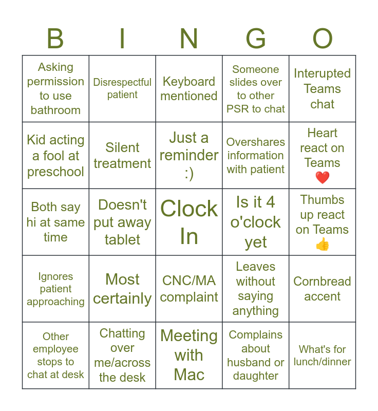 This bingo card has a free space and 24 words: Most certainly, Chatting over me/across the desk, Just a reminder :), Other employee stops to chat at desk, Interupted Teams chat, Asking permission to use bathroom, Kid acting a fool at preschool, Disrespectful patient, Is it 4 o'clock yet, CNC/MA complaint, Overshares information with patient, Both say hi at same time, Leaves without saying anything, Cornbread accent, Silent treatment, Complains about husband or daughter, Thumbs up react on Teams 👍, Keyboard mentioned, Heart react on Teams ❤️, Doesn't put away tablet, What's for lunch/dinner, Ignores patient approaching, Someone slides over to other PSR to chat and Meeting with Mac.
