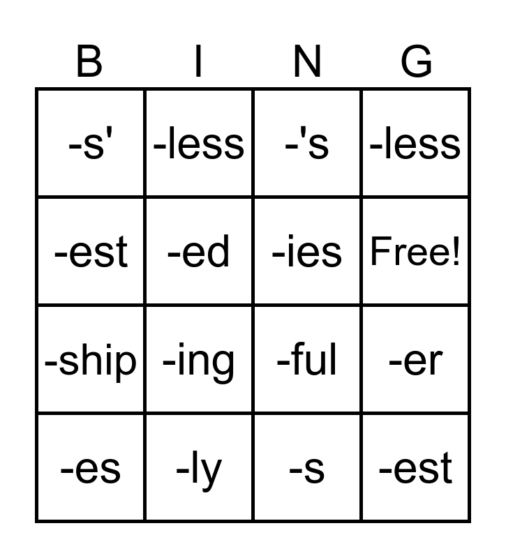 This bingo card has 17 words: -s, -es, -'s, -s', -ing, -less, -er, -ies, Free!, -ed, -ly, -ful, -est, -less, -ship, -y and -est.