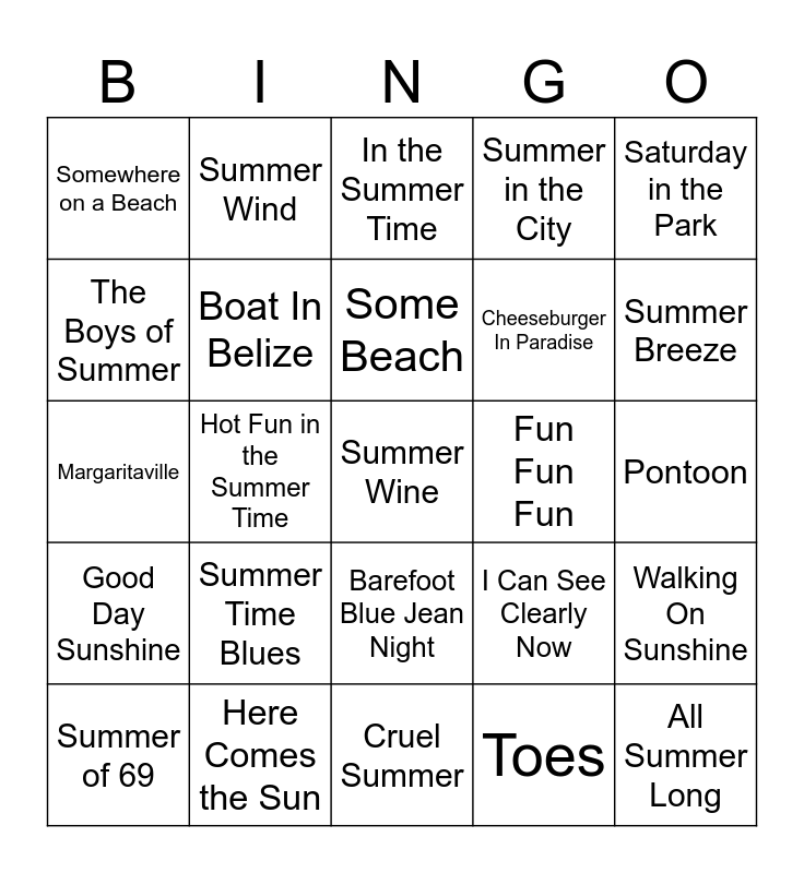 This bingo card has 25 words: Summer Time Blues, Cruel Summer, Some Beach, Summer of 69, Saturday in the Park, Somewhere on a Beach, The Boys of Summer, Summer Wind, Fun Fun Fun, Barefoot Blue Jean Night, Cheeseburger In Paradise, Margaritaville, I Can See Clearly Now, Walking On Sunshine, Boat In Belize, All Summer Long, Pontoon, In the Summer Time, Summer Breeze, Hot Fun in the Summer Time, Summer Wine, Here Comes the Sun, Good Day Sunshine, Summer in the City and Toes.