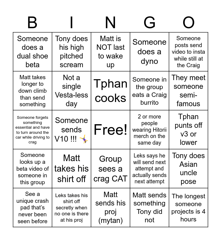 This bingo card has a free space and 24 words: Matt takes his shirt off, Leks takes his shirt off secretly when no one is there at his proj, Tphan cooks, See a unique crash pad that’s never been seen before, Someone posts send video to insta while still at the Craig, Someone does a dual shoe beta, Matt takes longer to down climb than send something, Tony does his high pitched scream, 2 or more people wearing Hitorii merch on the same day, Group sees a crag CAT, Someone in the group eats a Craig burrito, Someone forgets something essential and have to turn around the car while driving to crag, Leks says he will send next attempt and actually sends next attempt, Tony does Asian uncle pose, Not a single Vesta-less day, Matt sends something Tony did not, Tphan punts off v3 or lower, Matt is NOT last to wake up, They meet someone semi-famous, Someone sends V10 !!! 🤸♀️, The longest someone projects is 4 hours, Someone looks up a beta video of someone in this group, Someone does a dyno and Matt sends his proj (mytan).