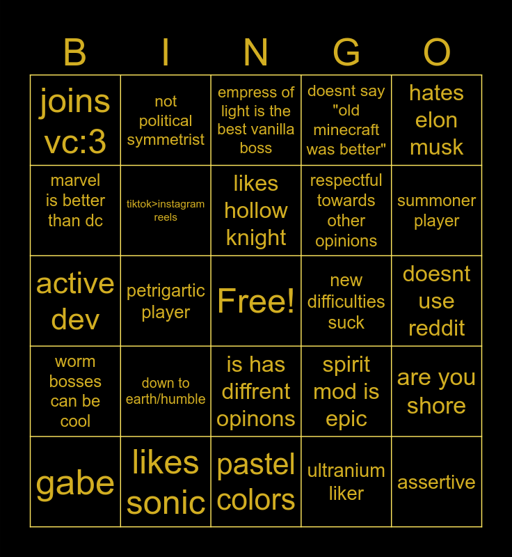 This bingo card has a free space and 24 words: down to earth/humble, likes sonic, likes hollow knight, gabe, hates elon musk, joins vc:3, marvel is better than dc, not political symmetrist, new difficulties suck, is has diffrent opinons, respectful towards other opinions, active dev, spirit mod is epic, are you shore, tiktok>instagram reels, ultranium liker, doesnt use reddit, empress of light is the best vanilla boss, summoner player, petrigartic player, assertive, worm bosses can be cool, doesnt say "old minecraft was better" and pastel colors.
