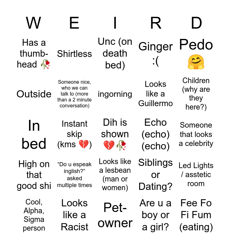 This bingo card has a free space and 38 words: Looks like the feeling of wanting to fart, but canโt, Bald :(, In a threesome (group of three), Echo (echo)(echo), Led Lights / asstetic room, High on that good shi, Instant skip (kms ๐), Do / Party Animal (hoot hoot), Looks like a Guillermo, Children (why are they here?), Outside, Someone nice, who we can talk to (more than a 2 minute conversation), Are u a boy or a girl?, Someone that looks a celebrity, Has a thumb-head ๐ฅ, โDo u espeak inglish?โ asked multiple times, Gets scared of Bryan ๐, Ginger :(, Gooning / arm is rapidly shaking, In bed, Shirtless, Pet-owner, Siblings or Dating?, Fee Fo Fi Fum (eating), Empl0y*d people ๐, pro gamer, Looks like a lesbean (man or women), Trumpie, Very lagโ gy, Cool room, Meet Somone with Same interest (cool beans!), ingorning, โAge????โ, Pedo ๐ค, Cool, Alpha, Sigma person, Looks like a Racist, Unc (on death bed) and White person who says n-word.