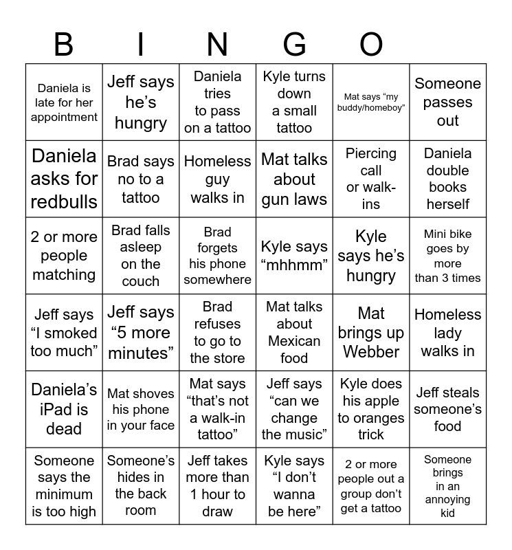 This bingo card has 36 words: Jeff says “can we change the music”, Mat says “that’s not a walk-in tattoo”, Kyle says “I don’t wanna be here”, Daniela asks for redbulls, Jeff says “I smoked too much”, Kyle says “mhhmm”, Brad says no to a tattoo, Jeff takes more than 1 hour to draw, Mat says “my buddy/homeboy”, Kyle does his apple to oranges trick, Daniela double books herself, Kyle turns down a small tattoo, Jeff steals someone’s food, Brad falls asleep on the couch, Mat talks about gun laws, Daniela is late for her appointment, Daniela’s iPad is dead, Kyle says he’s hungry, 2 or more people matching, Daniela tries to pass on a tattoo, Brad forgets his phone somewhere, Jeff says “5 more minutes”, Mat talks about Mexican food, Brad refuses to go to the store, Mat brings up Webber, Jeff says he’s hungry, Piercing call or walk-ins, Someone’s hides in the back room, Homeless guy walks in, Someone passes out, Someone brings in an annoying kid, Someone says the minimum is too high, Homeless lady walks in, Mini bike goes by more than 3 times, Mat shoves his phone in your face and 2 or more people out a group don’t get a tattoo.