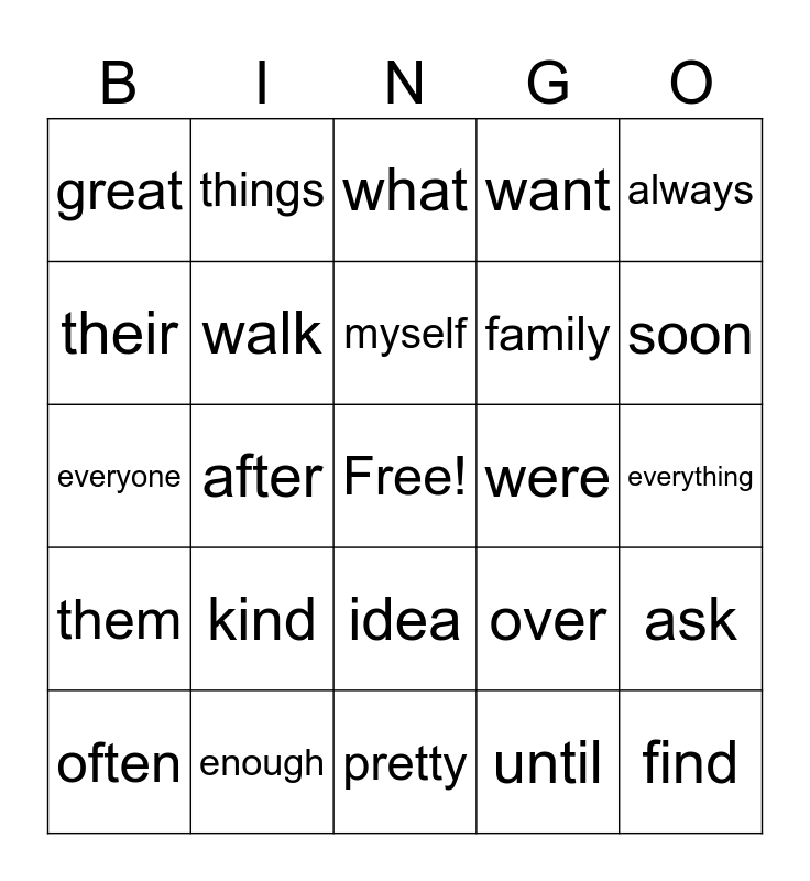 This bingo card has a free space and 25 words: kind, pretty, myself, often, always, great, their, things, were, idea, family, everyone, over, ask, walk, under, everything, what, soon, after, find, enough, them, want and until.