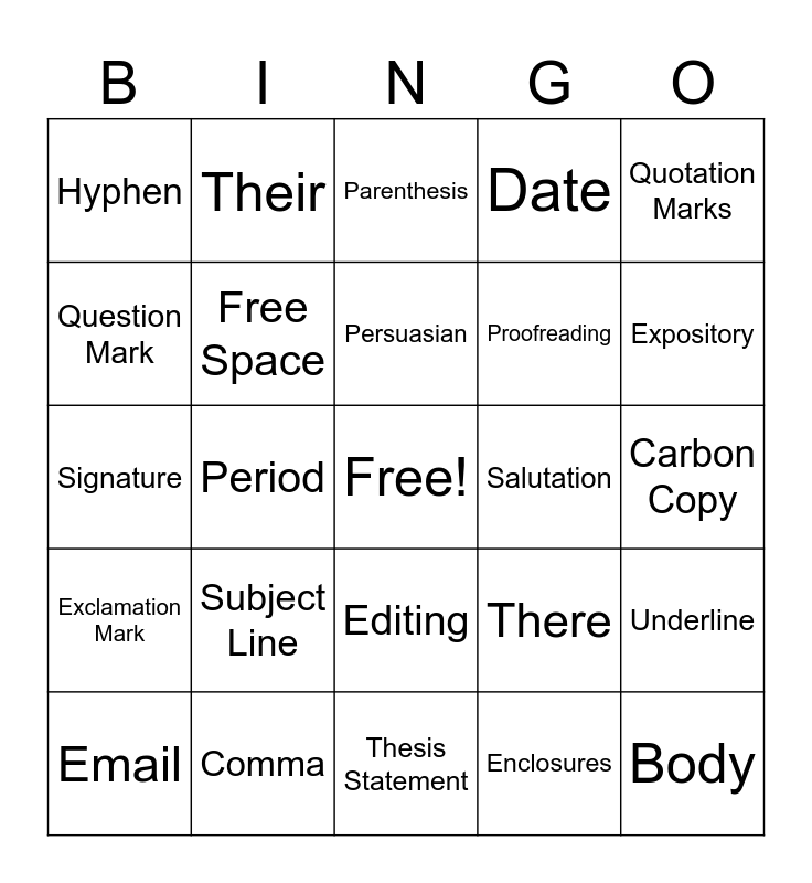 This bingo card has a free space and 24 words: Subject Line, Comma, Persuasian, Email, Quotation Marks, Hyphen, Question Mark, Their, Salutation, Editing, Proofreading, Signature, There, Underline, Free Space, Enclosures, Carbon Copy, Parenthesis, Expository, Period, Body, Exclamation Mark, Date and Thesis Statement.