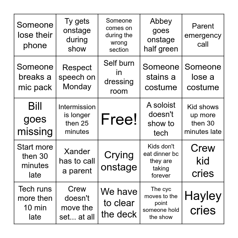 This bingo card has a free space and 39 words: Kids are screaming backstage, Costume jail day 1, Mic jail day 1, Respect speech on Monday, Tech runs more then 10 min late, Crying onstage, Self burn in dressing room, A SM throws something at a kid, Parent emergency call, Start more then 30 minutes late, Intermission is longer then 25 minutes, Abbey goes onstage half green, Hayley cries, Kid shows up more then 30 minutes late, A soloist doesn't show to tech, Xander has to call a parent, We run full show in one day, Someone lose their phone, Bill forgets to let us in, Kids don't eat dinner bc they are taking forever, Someone breaks a mic pack, We have to clear the deck, Someone stains a costume, Someone lose a costume, Allergic reaction to makeup, Someone comes on stage half dressed, Mic or wig comes off, Some technical thing just doesn't work, Someone dose something to their mic sound can't fix, Ty gets onstage during show, Hair and makeup is late, Missed sound cue, Someone comes on during the wrong section, Crew doesn't move the set... at all, The cyc moves to the point someone hold the show, Only run two sections during tech, Crew kid cries, Bill goes missing and The main goes off rail.
