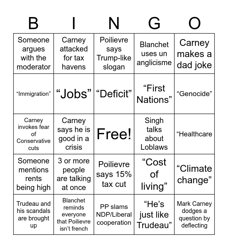 This bingo card has a free space and 44 words: PP mentions the biological clock, Mark Carney dodges a question by deflecting, Pipelines mentioned as economic solution, Trudeau and his scandals are brought up, “He’s just like Trump”, “He’s just like Trudeau”, Poilievre says Trump-like slogan, Poilievre says “Stop the Crime”, Carney makes a dad joke, Blanchet reminds everyone that Poilievre isn’t french, Blanchet uses un anglicisme, Singh talks about Loblaws, Poilievre says 15% tax cut, 3 or more people are talking at once, Singh compares Carney to PP, PP slams NDP/Liberal cooperation, Singh brings up dental care, Carney invokes fear of Conservative cuts, Someone names that Singh won’t be PM, “Genocide”, Carney attacked for tax havens, “Dental Care”, “Pharmacare”, Someone argues with the moderator, “Trans”, “Healthcare, “Tariff”, “Arms embargo”, “Cost of living”, Someone mentions rents being high, Someone references cost of groceries, “Climate change”, “Carbon tax”, “CEO”, Carney says he is good in a crisis, “Border”, “NATO”, “Crime”, “Deficit”, “Immigration”, “First Nations”, “Reconciliation”, “Jobs” and “Infrastructure”.