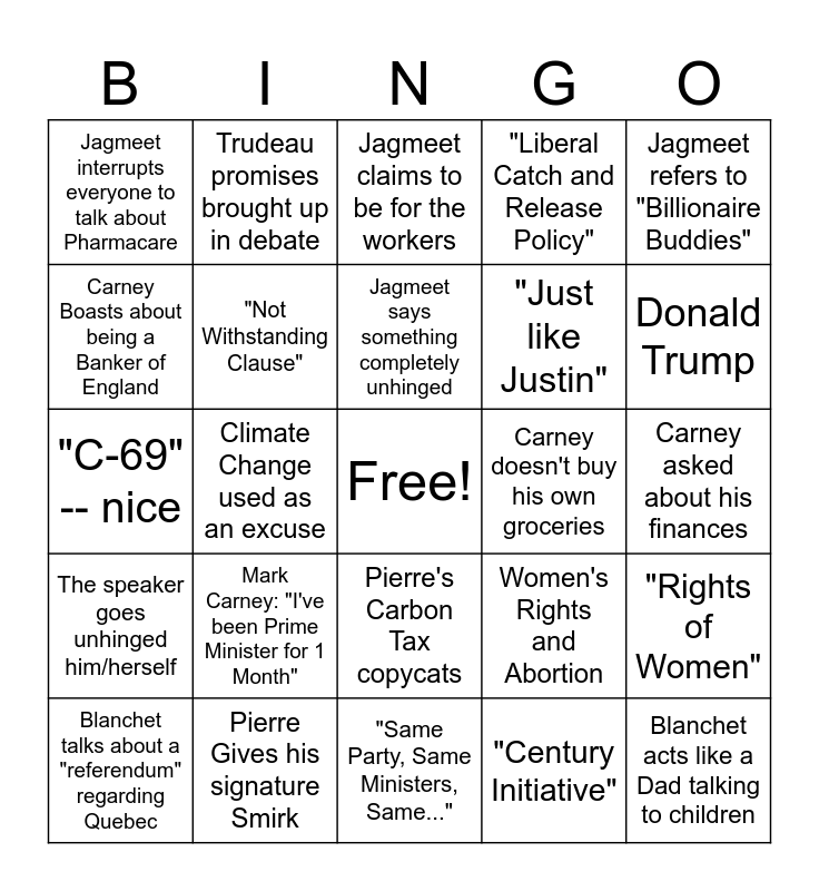 This bingo card has a free space and 24 words: Mark Carney: "I've been Prime Minister for 1 Month", Pierre Gives his signature Smirk, Jagmeet says something completely unhinged, Blanchet talks about a "referendum" regarding Quebec, Jagmeet refers to "Billionaire Buddies", Jagmeet interrupts everyone to talk about Pharmacare, Carney Boasts about being a Banker of England, Trudeau promises brought up in debate, Carney doesn't buy his own groceries, Pierre's Carbon Tax copycats, "Just like Justin", "C-69" -- nice, Women's Rights and Abortion, "Rights of Women", "Not Withstanding Clause", "Century Initiative", Carney asked about his finances, Jagmeet claims to be for the workers, Donald Trump, Climate Change used as an excuse, Blanchet acts like a Dad talking to children, The speaker goes unhinged him/herself, "Liberal Catch and Release Policy" and "Same Party, Same Ministers, Same...".