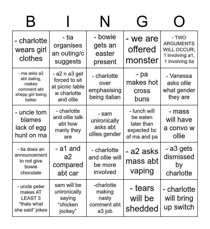 This bingo card has 25 words: - a1 and a2 compared abt car, -charlotte making nasty comment abt a3 job, - charlotte over emphasising being italian, - uncle peter makes AT LEAST 3 “thats what she said” jokes, - TWO ARGUMENTS WILL OCCUR; 1 involving a1, 1 involving tia, - charlotte wears girl clothes, - ma asks a2 abt dating, makes comment abt shepp girl being better, - tia organises an outing/c suggests, - lunch will be eaten later than expected bc of ma and pa, - charlotte and ollie will be more involved, - pa makes hot cross buns, - uncle tom blames lack of egg hunt on ma, - a2 asks mass abt vaping, - a3 gets dismissed by charlotte, - a2 n a3 get forced to sit at picnic table w charlotte and ollie, - charlotte will bring up switch, - mass will have a convo w ollie, - bowie gets an easter present, - Vanessa asks ollie what gender they are, - charlotte and ollie talk abt how manly they are, - sam unironically asks abt ollies gender, sam will be unironically saying “chicken jockey”, - tia does an announcement to not give bowie chocolate, - we are offered monster and - tears will be shedded.