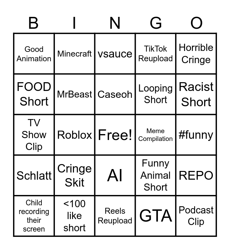 This bingo card has a free space and 24 words: Cringe Skit, <100 like short, Caseoh, Child recording their screen, Horrible Cringe, Good Animation, FOOD Short, Minecraft, Meme Compilation, AI, Looping Short, TV Show Clip, Funny Animal Short, REPO, MrBeast, GTA, #funny, vsauce, Racist Short, Roblox, Podcast Clip, Schlatt, TikTok Reupload and Reels Reupload.