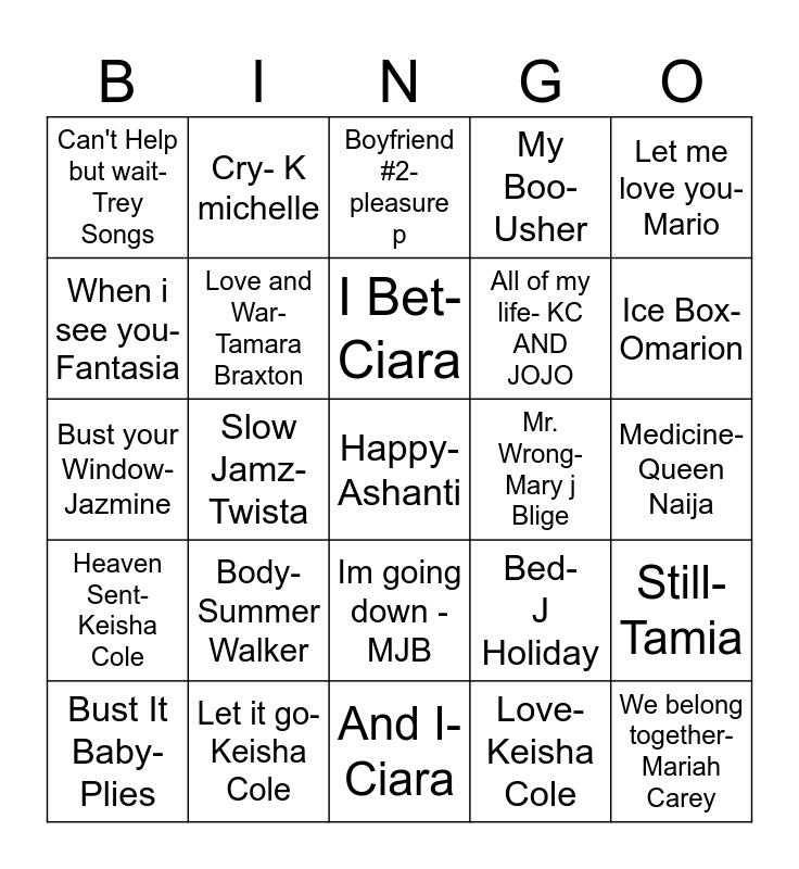 This bingo card has 1 images and 28 words: Bust It Baby-Plies, Ride with Me-Nelly, Happy-Ashanti, Love-Keisha Cole, Let me love you-Mario, When i see you-Fantasia, Cry- K michelle, And I- Ciara, Mr. Wrong-Mary j Blige, We belong together-Mariah Carey, Bust your Window- Jazmine, Love and War-Tamara Braxton, Bed- J Holiday, Medicine- Queen Naija, Can't raise a man- K Michelle, Slow Jamz- Twista, Im going down - MJB, My Boo-Usher, Still- Tamia, Heaven Sent- Keisha Cole, Let it go-Keisha Cole, I Bet- Ciara, All of my life- KC AND JOJO, Ice Box- Omarion, Can't Help but wait- Trey Songs, Body- Summer Walker, Boyfriend #2- pleasure p and Always Be m baby- Mariah Carey.