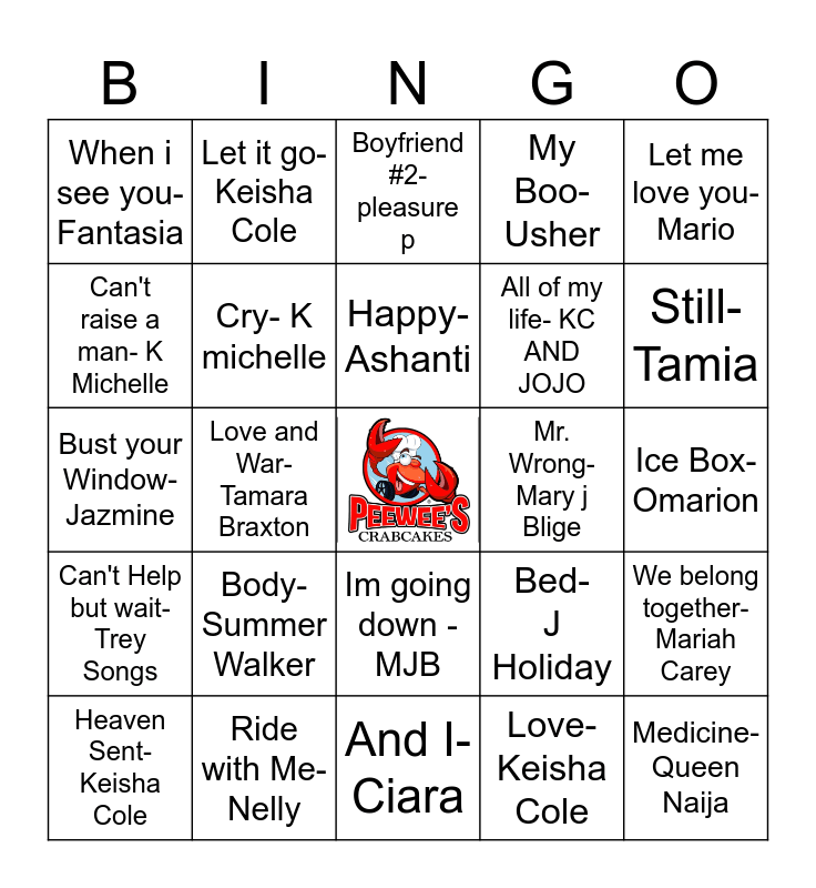 This bingo card has a free space and 28 words: Bust It Baby-Plies, Ride with Me-Nelly, Happy-Ashanti, Love-Keisha Cole, Let me love you-Mario, When i see you-Fantasia, Cry- K michelle, And I- Ciara, Mr. Wrong-Mary j Blige, We belong together-Mariah Carey, Bust your Window- Jazmine, Love and War-Tamara Braxton, Bed- J Holiday, Medicine- Queen Naija, Can't raise a man- K Michelle, Slow Jamz- Twista, Im going down - MJB, My Boo-Usher, Still- Tamia, Heaven Sent- Keisha Cole, Let it go-Keisha Cole, I Bet- Ciara, All of my life- KC AND JOJO, Ice Box- Omarion, Can't Help but wait- Trey Songs, Body- Summer Walker, Boyfriend #2- pleasure p and Always Be m baby- Mariah Carey.