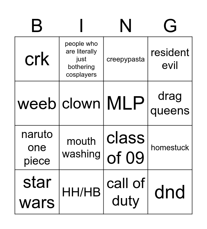 This bingo card has 30 words: Free!, miku, homestuck, arcane (excluding us), crk, creepypasta, MLP, genshin /honkai, HH/HB, jjk, call of duty, star wars, furry/therian, ENA, mouth washing, under tale delta rune, pokemkn, dnd, ZZZ, weeb, class of 09, insanely beautiful/good, people who are literally just bothering cosplayers, naruto one piece, clown, resident evil, silent hill, spider-man / spider verse, drag queens and roblox games.