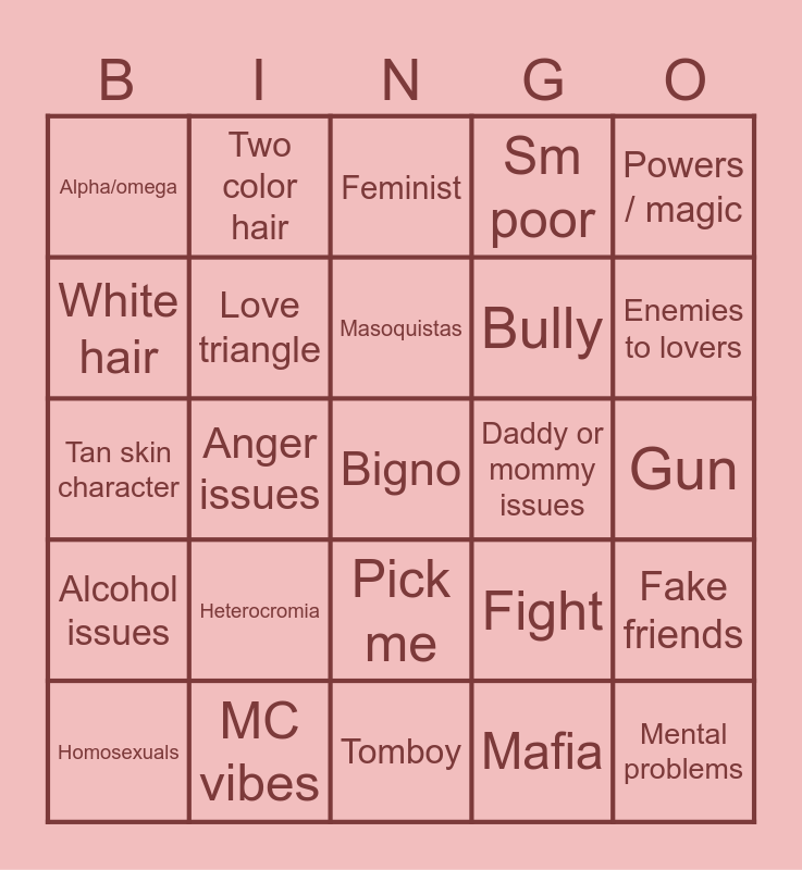 This bingo card has a free space and 24 words: Heterocromia, MC vibes, Masoquistas, Homosexuals, Powers / magic, Alpha/omega, White hair, Two color hair, Daddy or mommy issues, Pick me, Bully, Tan skin character, Fight, Fake friends, Love triangle, Mafia, Gun, Feminist, Enemies to lovers, Anger issues, Mental problems, Alcohol issues, Sm poor and Tomboy.