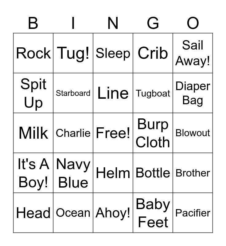 This bingo card has a free space and 39 words: Nautical, Tiny Sailor, Port, Starboard, Head, Helm, Line, Anchor, Sail Away!, It's A Boy!, Charlie, Crib, Pacifier, Blowout, Burp Cloth, Navy Blue, Stroller, Rock, Waves, Bottle, Spit Up, Ahoy!, Tugboat, Diaper Bag, Lullaby, Knot, Navigate, Chart, Mighty, Tug!, Mommy, Daddy, Sleep, Ocean, Baby Feet, Tiny hands, Brother, Milk and Toys.