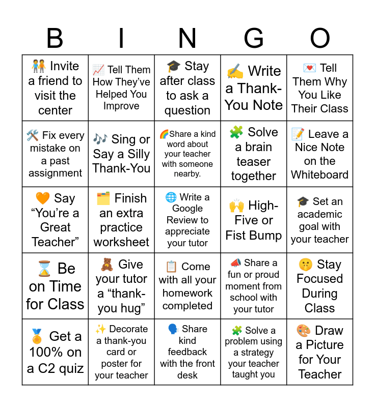 This bingo card has a free space and 24 words: π§Έ Give your tutor a βthank-you hugβ, β¨ Decorate a thank-you card or poster for your teacher, πShare a kind word about your teacher with someone nearby., π Get a 100% on a C2 quiz, π Tell Them Why You Like Their Class, π§βπ€βπ§ Invite a friend to visit the center, π οΈ Fix every mistake on a past assignment, π Tell Them How Theyβve Helped You Improve, π High-Five or Fist Bump, π Come with all your homework completed, π§© Solve a brain teaser together, π§‘ Say βYouβre a Great Teacherβ, π£ Share a fun or proud moment from school with your tutor, π€« Stay Focused During Class, πΆ Sing or Say a Silly Thank-You, π§© Solve a problem using a strategy your teacher taught you, π Set an academic goal with your teacher, π Stay after class to ask a question, π Leave a Nice Note on the Whiteboard, ποΈ Finish an extra practice worksheet, π¨ Draw a Picture for Your Teacher, β Be on Time for Class, βοΈ Write a Thank-You Note and π£οΈ Share kind feedback with the front desk.