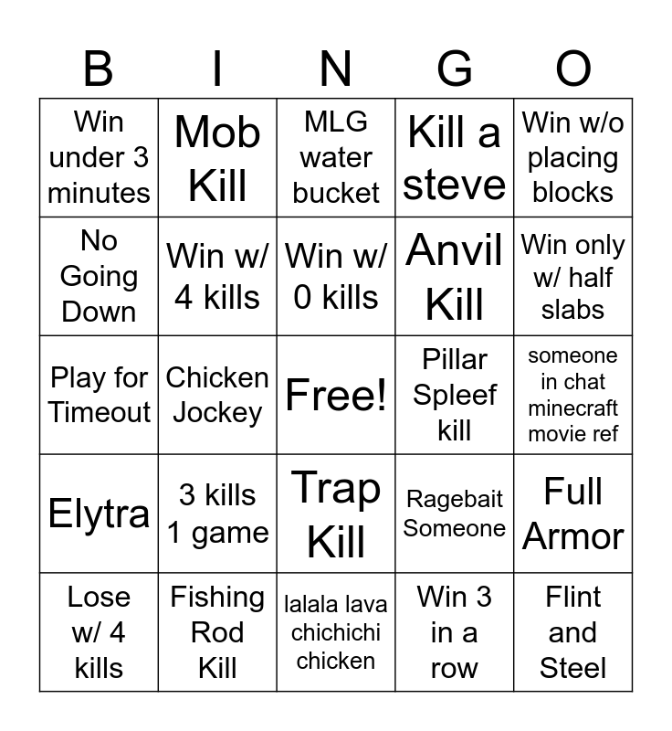 This bingo card has a free space and 24 words: 3 kills 1 game, Fishing Rod Kill, Win w/ 0 kills, Lose w/ 4 kills, Win w/o placing blocks, Win under 3 minutes, No Going Down, Mob Kill, Pillar Spleef kill, Trap Kill, Anvil Kill, Play for Timeout, Ragebait Someone, Full Armor, Win w/ 4 kills, Win 3 in a row, someone in chat minecraft movie ref, MLG water bucket, Win only w/ half slabs, Chicken Jockey, Flint and Steel, Elytra, Kill a steve and lalala lava chichichi chicken.