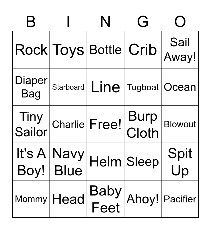 This bingo card has a free space and 40 words: Nautical, Tiny Sailor, Port, Starboard, Head, Helm, Line, Anchor, Sail Away!, It's A Boy!, Charlie, Crib, Pacifier, Blowout, Burp Cloth, Navy Blue, Stroller, Rock, Waves, Bottle, Spit Up, Ahoy!, Tugboat, Diaper Bag, Baby Feet, Lullaby, Knot, Navigate, Chart, Mighty, Tug!, Mommy, Daddy, Sleep, Ocean, Baby Feet, Tiny hands, Milk, Toys and Snuggle.