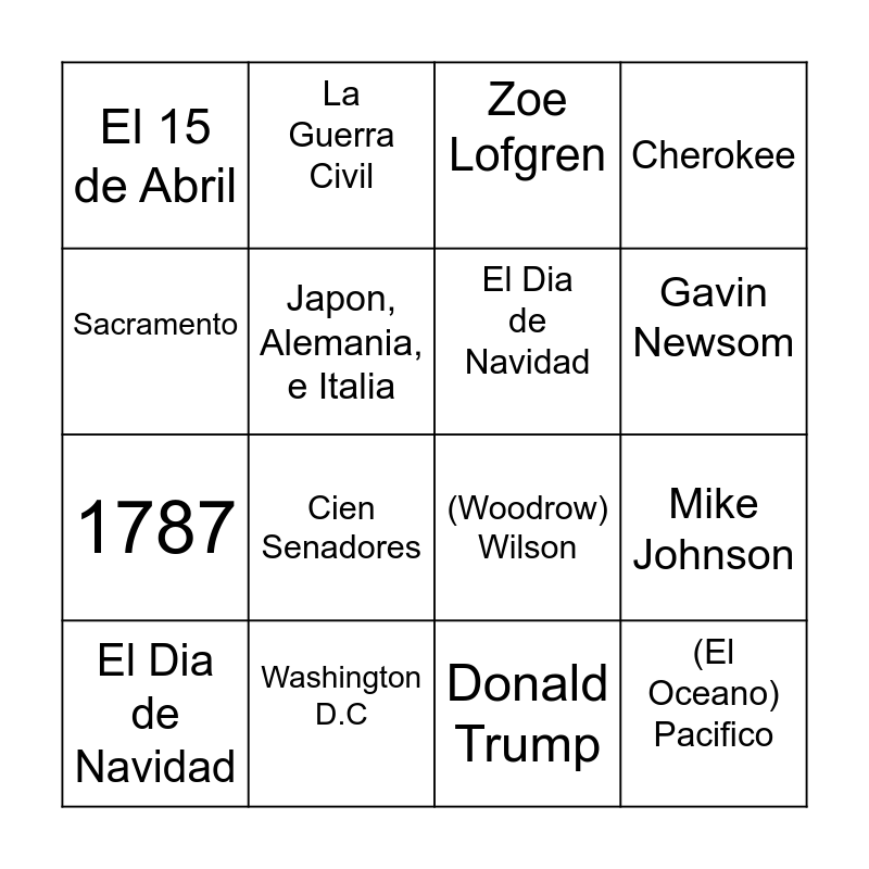 This bingo card has 32 words: (El Rio) Missouri, JD Vance, Mike Johnson, (George) Washington, (El Oceano) Pacifico, El Dia de Navidad, Sacramento, Porque hay 50 estados, La Guerra Civil, (El Puerto de) Nueva York, Gavin Newsom, Zoe Lofgren, Congreso, La Constitucion, Washington D.C, Puerto Rico, (El Oceano) Atlantico, (Woodrow) Wilson, Comunismo, Republicano, la Corte Suprema, Alex Padilla, Donald Trump, Nosotos,el pueblo, El Dia de Navidad, Cherokee, 1787, Japon, Alemania, e Italia, El 15 de Abril, Africanos, Noviembre and Cien Senadores.