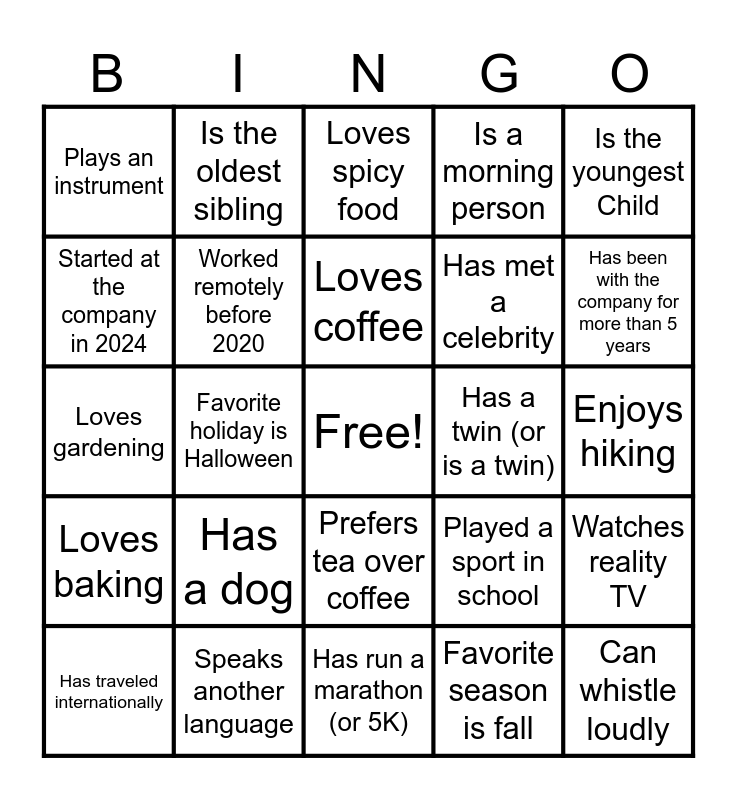 This bingo card has a free space and 24 words: Has a dog, Speaks another language, Loves coffee, Has traveled internationally, Is the youngest Child, Plays an instrument, Started at the company in 2024, Is the oldest sibling, Has a twin (or is a twin), Prefers tea over coffee, Has met a celebrity, Loves gardening, Played a sport in school, Watches reality TV, Worked remotely before 2020, Favorite season is fall, Enjoys hiking, Loves spicy food, Has been with the company for more than 5 years, Favorite holiday is Halloween, Can whistle loudly, Loves baking, Is a morning person and Has run a marathon (or 5K).