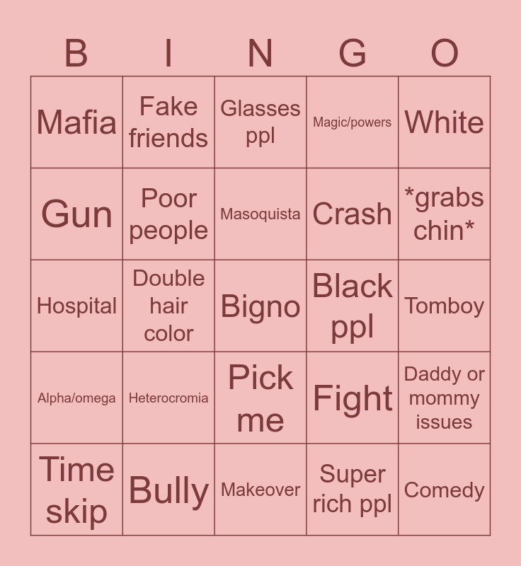 This bingo card has a free space and 24 words: Heterocromia, Bully, Masoquista, Time skip, White, Mafia, Gun, Fake friends, Black ppl, Pick me, Crash, Hospital, Fight, Daddy or mommy issues, Poor people, Super rich ppl, Tomboy, Glasses ppl, *grabs chin*, Double hair color, Comedy, Alpha/omega, Magic/powers and Makeover.