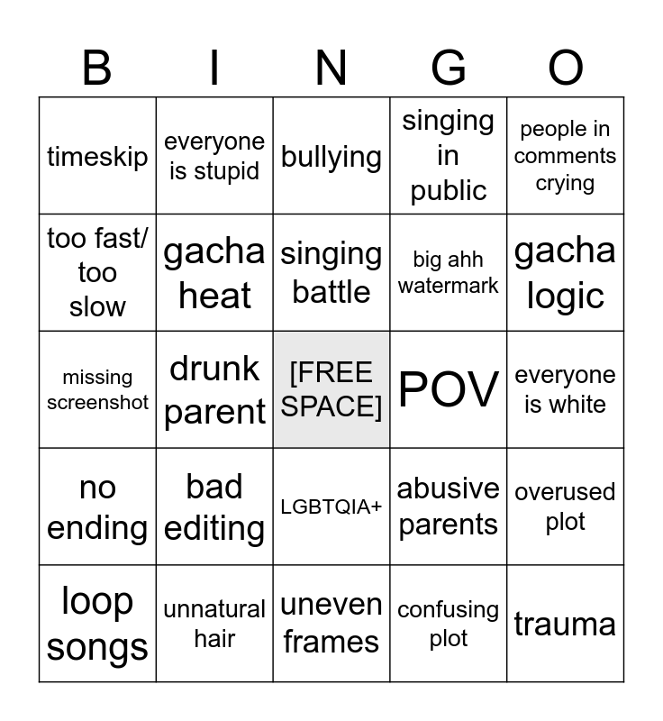 This bingo card has a free space and 34 words: powers, confusing plot, furry/ hybrids, horrible spelling, no ending, gacha heat, people in comments crying, loop songs, everyone is stupid, bad boy, singing battle, bullying, disclaimer(s), favourite child, POV, gacha logic, unnatural hair, missing screenshot, bad editing, abusive parents, LGBTQIA+, intro or outro, timeskip, everyone is white, uneven frames, trauma, singing in public, ‘reacts’, big ahh watermark, too fast/ too slow, straight ship, drunk parent, overused plot and unfinished.