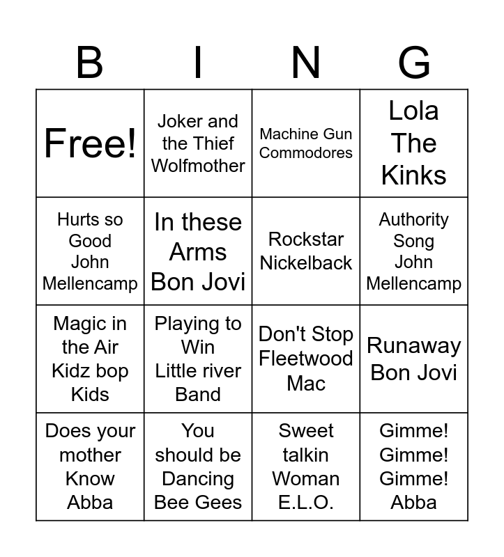 This bingo card has 16 words: Does your mother Know Abba, You should be Dancing Bee Gees, Machine Gun Commodores, Lola The Kinks, Hurts so Good John Mellencamp, Joker and the Thief Wolfmother, Don't Stop Fleetwood Mac, Runaway Bon Jovi, Free!, In these Arms Bon Jovi, Sweet talkin Woman E.L.O., Authority Song John Mellencamp, Magic in the Air Kidz bop Kids, Playing to Win Little river Band, Rockstar Nickelback and Gimme! Gimme! Gimme! Abba.
