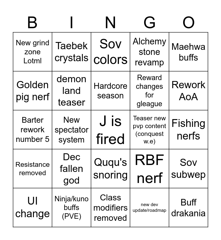 This bingo card has a free space and 24 words: Dec fallen god, Ninja/kuno buffs (PVE), Hardcore season, UI change, Maehwa buffs, New grind zone Lotml, Golden pig nerf, Taebek crystals, Teaser new pvp content (conquest w.e), Ququ's snoring, Reward changes for gleague, Barter rework number 5, RBF nerf, Sov subwep, demon land teaser, new dev update/roadmap, Fishing nerfs, Sov colors, Rework AoA, New spectator system, Buff drakania, Resistance removed, Alchemy stone revamp and Class modifiers removed.
