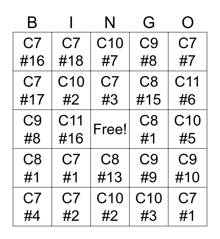 This bingo card has a free space and 24 words: C7 #1, C7 #2, C7 #3, C7 #4, C7 #7, C7 #16, C7 #17, C7 #18, C8 #1, C8 #13, C8 #15, C9 #8, C9 #9, C9 #10, C10 #2, C10 #3, C10 #5, C10 #7, C11 #6, C11 #16, C7 #1, C8 #1, C9 #8 and C10 #2.