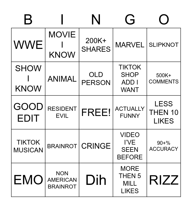 This bingo card has a free space and 24 words: BRAINROT, NON AMERICAN BRAINROT, OLD PERSON, EMO, SLIPKNOT, WWE, SHOW I KNOW, MOVIE I KNOW, ACTUALLY FUNNY, CRINGE, TIKTOK SHOP ADD I WANT, GOOD EDIT, VIDEO I’VE SEEN BEFORE, 90+% ACCURACY, ANIMAL, MORE THEN 5 MILL LIKES, LESS THEN 10 LIKES, 200K+ SHARES, 500K+ COMMENTS, RESIDENT EVIL, RIZZ, TIKTOK MUSICAN, MARVEL and Dih.