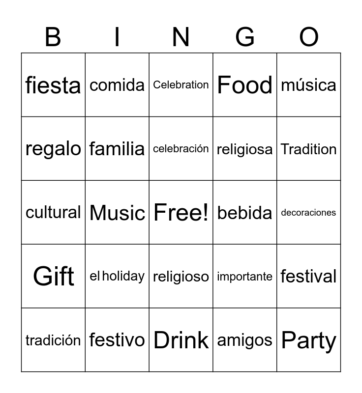This bingo card has a free space and 24 words: el holiday, festivo, celebración, tradición, música, fiesta, regalo, comida, bebida, religioso, religiosa, cultural, importante, festival, familia, amigos, decoraciones, Celebration, Tradition, Music, Party, Gift, Food and Drink.
