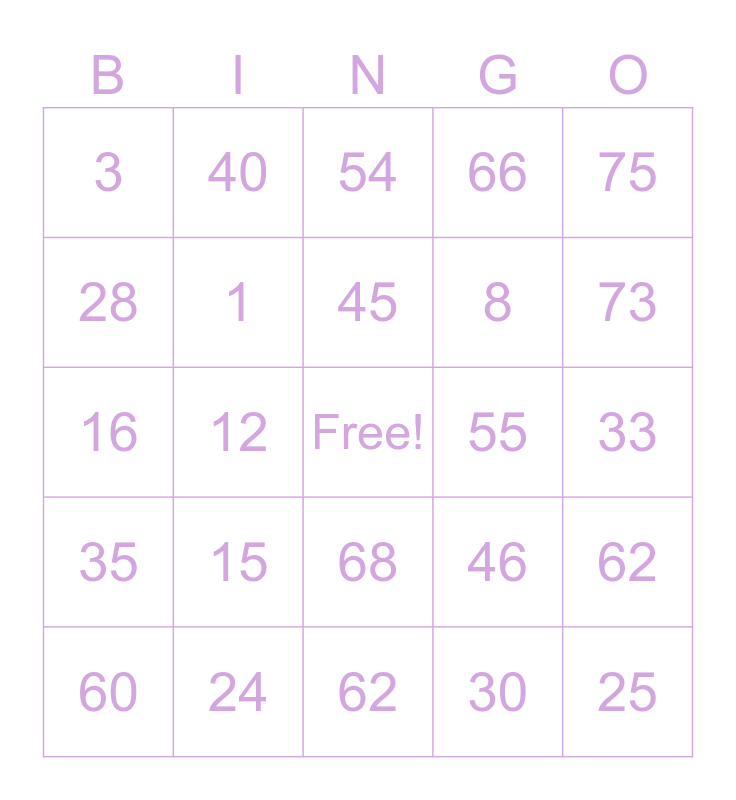 This bingo card has a free space and 24 words: 15, 24, 45, 60, 75, 3, 28, 40, 55, 68, 8, 16, 46, 62, 1, 30, 33, 54, 73, 12, 25, 35, 66 and 62.